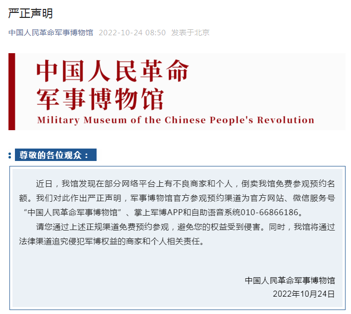 近日部分網(wǎng)絡(luò)平臺(tái)上有商家和個(gè)人倒賣該館免費(fèi)參觀預(yù)約名額。對(duì)此,軍博嚴(yán)正聲明,該館參觀預(yù)約渠道為官方網(wǎng)站、微信服務(wù)號(hào)“中國人民革命軍事博物館”、掌上軍博APP和自助語音系統(tǒng)010-66866186。觀眾要通過上述正規(guī)渠道免費(fèi)預(yù)約參觀,避免權(quán)益受到侵害。同時(shí),該館將通過法律渠道追究侵犯軍博權(quán)益的商家和個(gè)人相關(guān)責(zé)任。