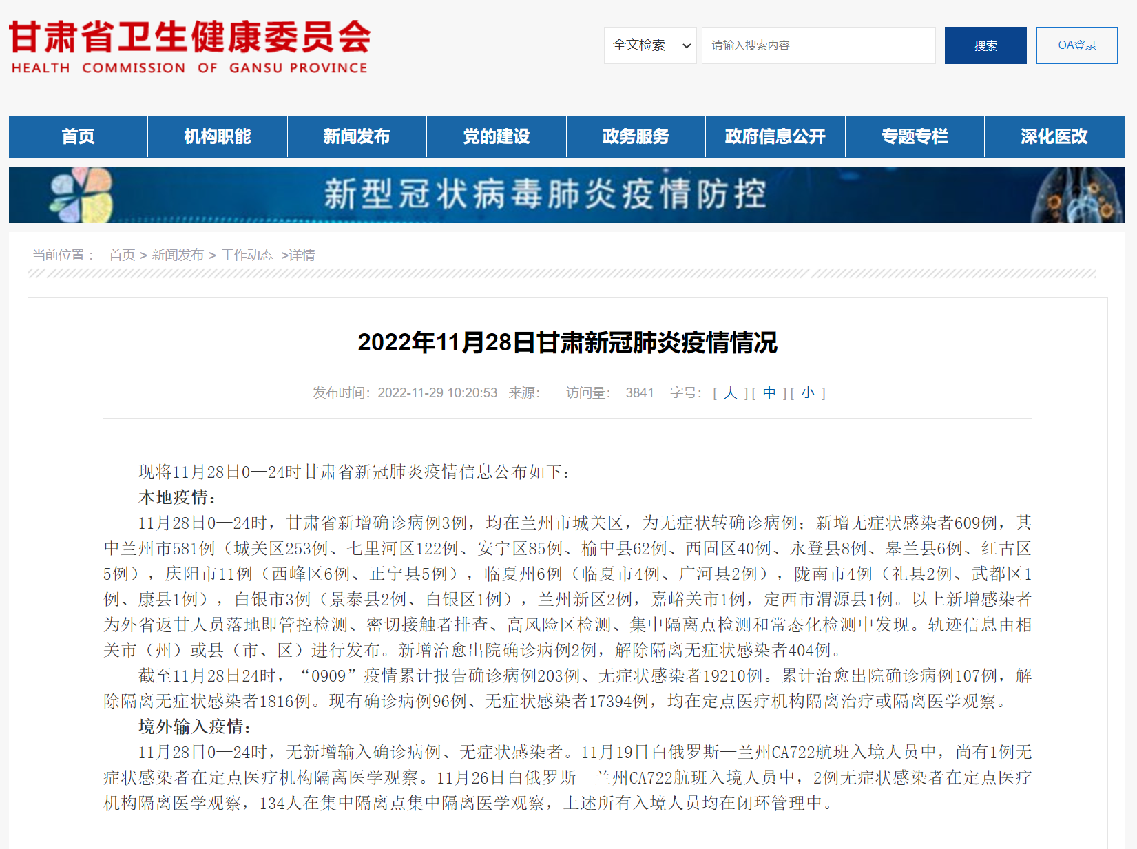 11月28日甘肅新增確診病例3例,無癥狀感染者609例