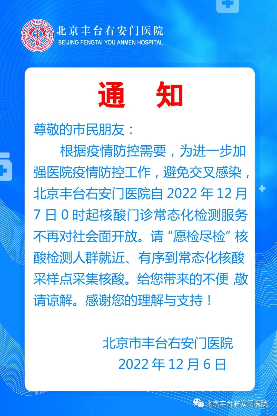 12月6日,北京豐臺(tái)右安門醫(yī)院發(fā)布核酸門診停診通知。其中提到,12月7日起核酸門診常態(tài)化檢測服務(wù)不再對(duì)社會(huì)面開放。