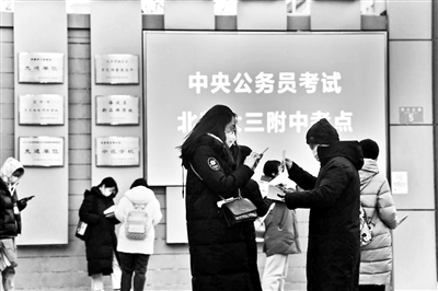 昨日早上8點,北京師范大學第三附屬中學的考點已有考生陸續(xù)到場。一些公考輔導機構(gòu)在考點門前派發(fā)復習資料,北京青年報記者看到,黨的二十大報告,北京冬奧會、冬殘奧會,2022年中央一號文件等時事熱點都被列為重點內(nèi)容。8點20分,考生開始入場。工作人員手持測溫儀,對每個考生進行測溫??键c內(nèi)的一樓也設置了兩個備用考場。據(jù)悉,按照要求,有發(fā)熱(體溫≥37.3℃)等可疑癥狀的,應服從安排在備用考場佩戴N95口罩參加考試。