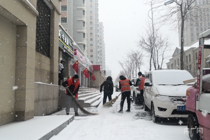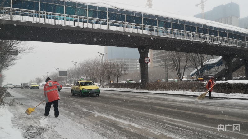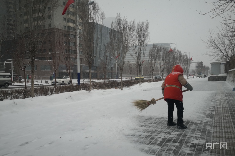 在新疆烏魯木齊市,環(huán)衛(wèi)工人正在清掃路面積雪(央廣網(wǎng)記者羅成 攝)
