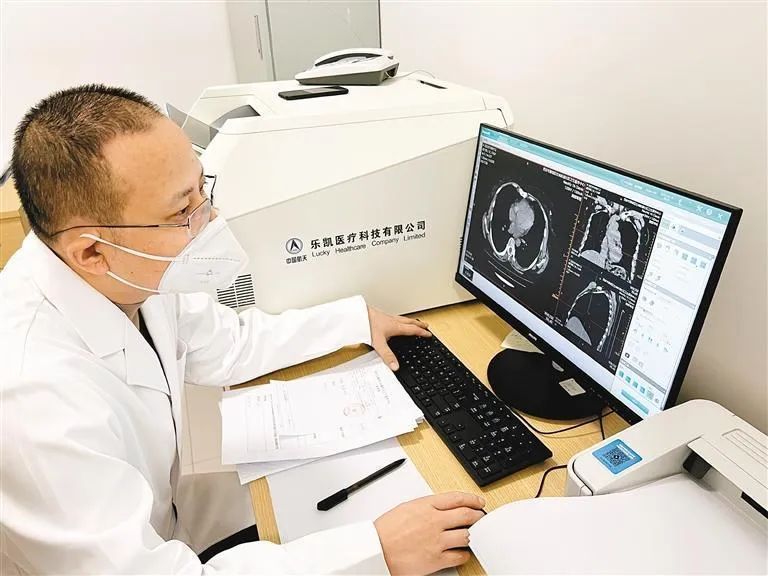10日上午,在杜城社區(qū)衛(wèi)生服務中心診室門前,等候拍片的患者不多。在工作人員引導下,大家有序進入拍攝區(qū)。診室內,陜西省康復醫(yī)院影像一科主任高雅鵬正在一個看似與普通顯示器沒什么兩樣的電腦前書寫診斷報告?!氨绕鹨话愕腃T靜態(tài)閱片,在這臺顯示器的幫助下,我們可以實現多角度、多方位、動態(tài)式閱片,讓診斷更加細致精準。” 高雅鵬說,這臺CT機的配置完全可以滿足周邊居民對于肺部CT的拍片需求。