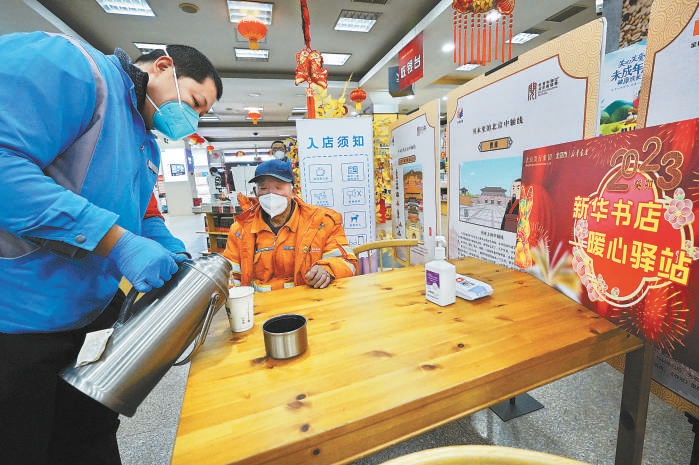 新華書店開設(shè)暖心驛站,為環(huán)衛(wèi)工人、快遞小哥等免費(fèi)提供熱水和休息場(chǎng)所。本報(bào)記者 程功攝