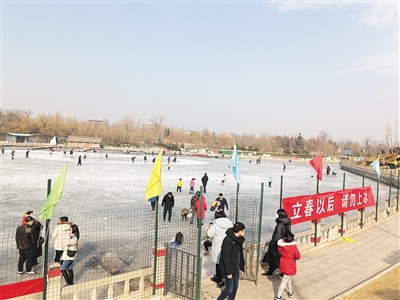但這并沒完全驅(qū)散人們對滑冰的熱情。2月5日,新京報記者來到奧林匹克公園龍形水系、八一湖、南護(hù)城河等多處水域發(fā)現(xiàn),“禁滑野冰”的條幅懸掛在旁邊,有安保人員在岸邊巡視,隨時勸返企圖上冰的游玩者。雖然多數(shù)市民能遵守規(guī)定,但仍有個別“冒險者”不顧勸阻,憑肉眼判斷和往年經(jīng)驗,堅持上冰。