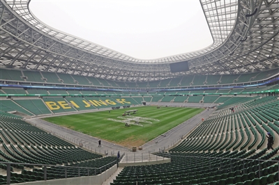 走進(jìn)新工體項目區(qū)域,清灰色外立面的工人體育場在陽光下熠熠生輝,綠茵賽場整裝待發(fā),看臺上環(huán)繞著寫有“北京國安”的綠色燈條。