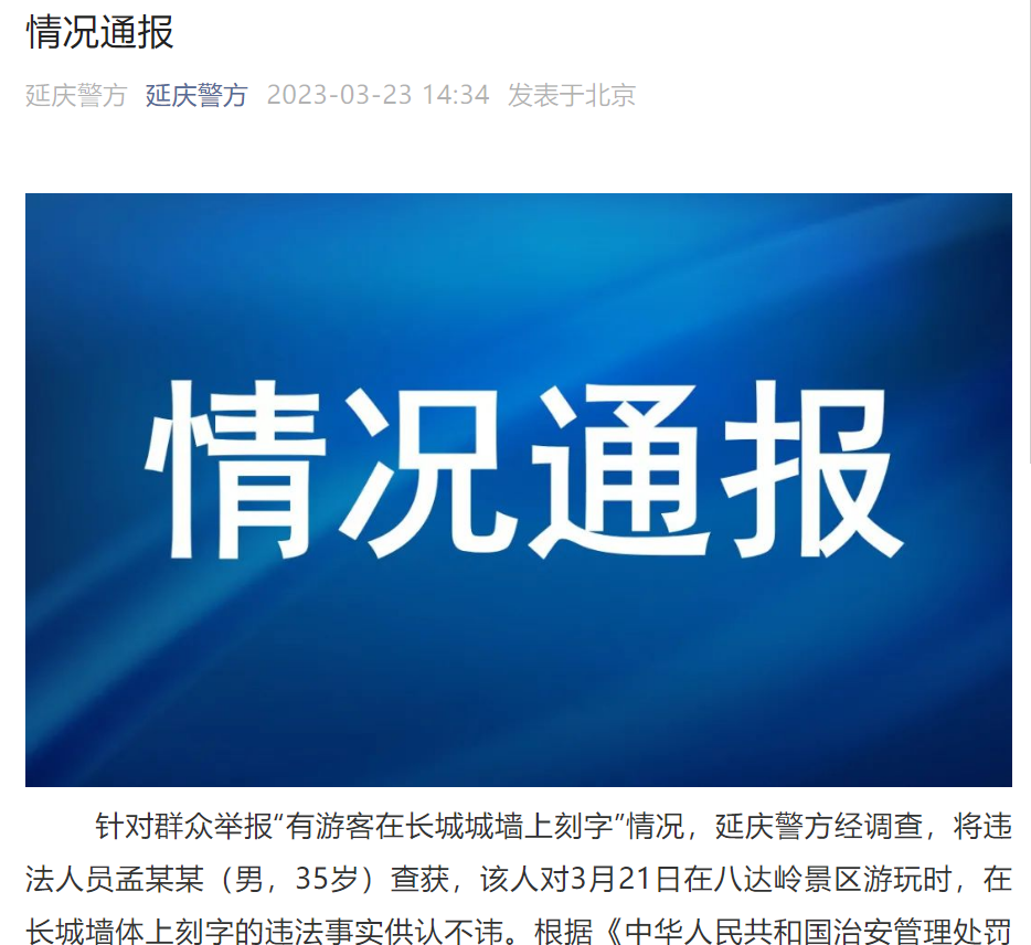 央廣網(wǎng)北京3月23日消息 據(jù)延慶警方微信公眾號(hào)3月23日情況通報(bào), 針對(duì)群眾舉報(bào)“有游客在長(zhǎng)城城墻上刻字”情況,延慶警方經(jīng)調(diào)查,將違法人員孟某某(男,35歲)查獲,該人對(duì)3月21日在八達(dá)嶺景區(qū)游玩時(shí),在長(zhǎng)城墻體上刻字的違法事實(shí)供認(rèn)不諱。根據(jù)《中華人民共和國(guó)治安管理處罰法》有關(guān)規(guī)定,延慶警方已對(duì)孟某某處以行政拘留并處罰款的處罰。