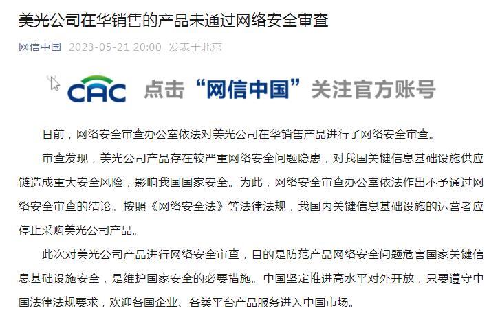 中新網(wǎng)5月21日電 據(jù)“網(wǎng)信中國(guó)”微信公眾號(hào)消息,日前,網(wǎng)絡(luò)安全審查辦公室依法對(duì)美光公司在華銷(xiāo)售產(chǎn)品進(jìn)行了網(wǎng)絡(luò)安全審查。
