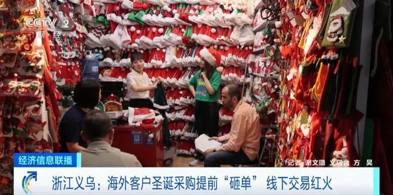 在義烏國際商貿(mào)城一區(qū)的攤位里,幾位來自黎巴嫩的采購商正在選購圣誕衣和圣誕帽。選品、談價(jià)、成交, 不到十分鐘,他們就簽下了一筆200萬元的訂單 。他們告訴記者,上一次來義烏還是2019年,此后一直在線上交易,今年可以重回線下采購,他們就提前啟程,并且擴(kuò)大了采購規(guī)模。