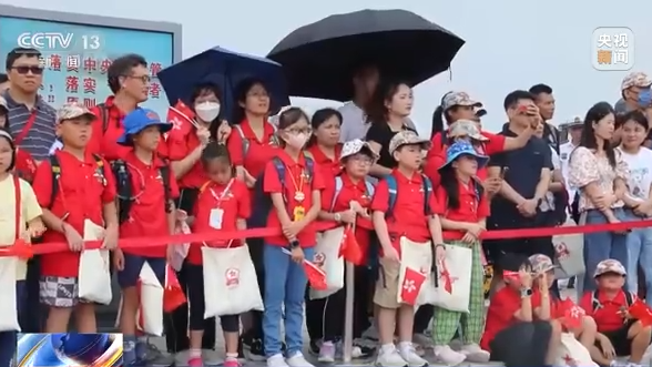 上午10時(shí),在昂船洲軍營,駐香港部隊(duì)三軍儀仗隊(duì)邁著鏗鏘有力的步伐護(hù)旗而出,伴隨著雄壯的《義勇軍進(jìn)行曲》,青少年們與解放軍官兵一起升國旗、唱國歌。在隨后的軍事課目表演中,突降大雨,官兵們頂著暴雨為現(xiàn)場觀眾展示了軍樂隊(duì)列、格斗技術(shù)、刺殺操、獵人戰(zhàn)斗等課目。
