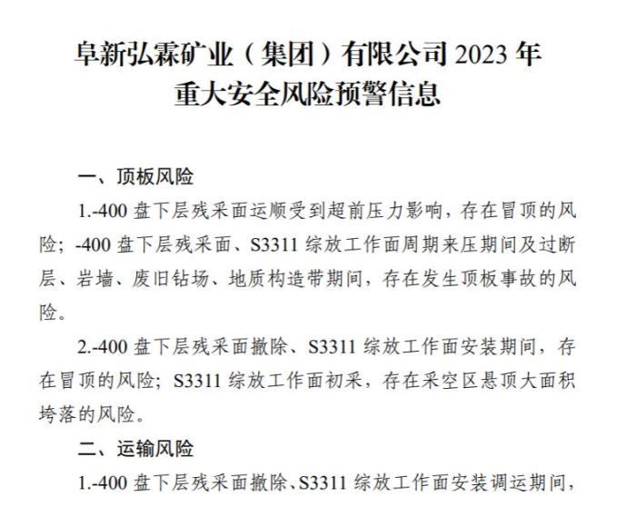 2023年1月,阜新市煤炭工業(yè)轉(zhuǎn)型發(fā)展局發(fā)布阜新市平安礦業(yè)有限責(zé)任公司和阜新弘霖礦業(yè)(集團(tuán))有限公司2023年重大安全風(fēng)險預(yù)警信息。其中提及,阜新弘霖礦業(yè)(集團(tuán))有限公司涉及運(yùn)輸風(fēng)險、火災(zāi)風(fēng)險、瓦斯風(fēng)險、爆炸風(fēng)險等。(完)