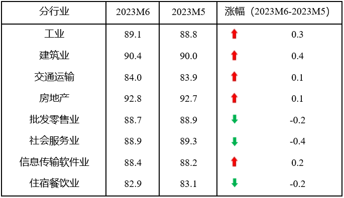 具體來看,6月份,8個分行業(yè)指數(shù)5升3降,工業(yè)、建筑業(yè)、交通運輸郵政倉儲業(yè)、房地產(chǎn)業(yè)和信息傳輸計算機服務軟件業(yè)指數(shù)分別上升0.3、0.4、0.1、0.1和0.2點,而批發(fā)零售業(yè)、社會服務業(yè)和住宿餐飲業(yè)指數(shù)分別下降0.2、0.4和0.2點。由此可見,工業(yè)和建筑業(yè)指數(shù)開始回升;而服務業(yè)指數(shù)的上漲勢頭出現(xiàn)回調(diào)。