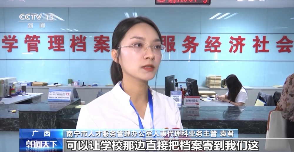 南寧市人才服務管理辦公室人事代理科業(yè)務主管 袁君:可以讓學校那邊直接把檔案寄到我們這,我們進行一個免費的托管,不需要學生本人再提供任何的工作材料到現(xiàn)場或者是在網(wǎng)上再辦理任何檔案接收手續(xù)。