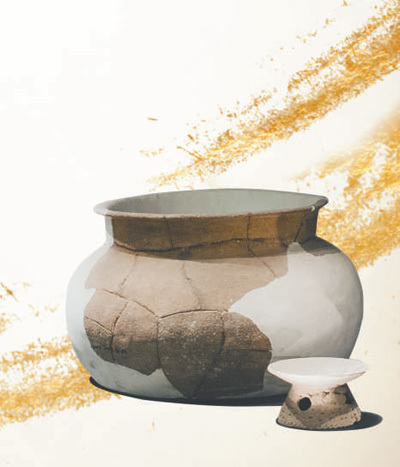 三星堆第三發(fā)掘區(qū)出土的陶高領(lǐng)甕(后)和陶鏤孔圈足盤。圖為三星堆博物館提供