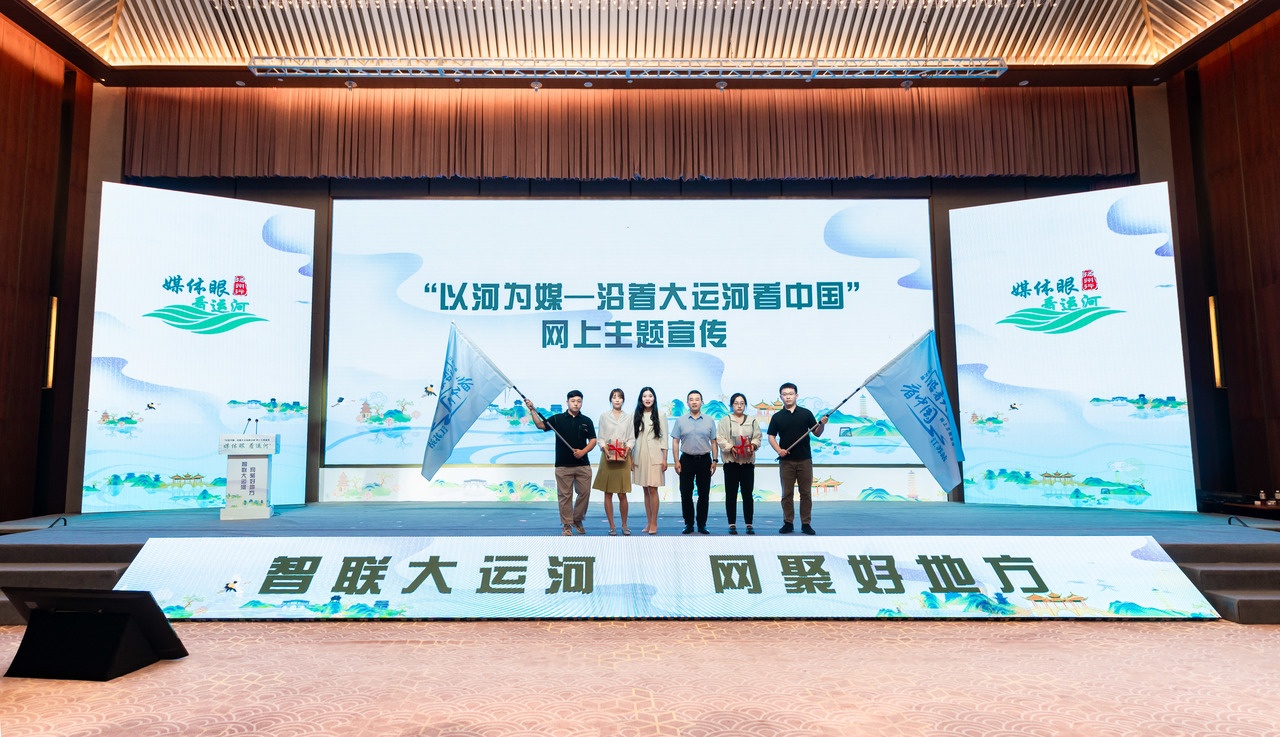 “以河為媒—沿著大運(yùn)河看中國”網(wǎng)上主題宣傳授旗、贈(zèng)書現(xiàn)場