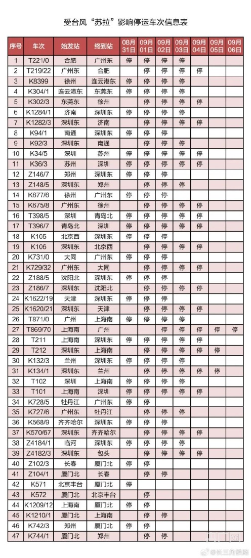 記者從中國鐵路上海局集團有限公司獲悉,受第9號臺風(fēng)“蘇拉”影響,為確保列車運行安全,鐵路部門計劃對杭深線、京港高鐵、廣深城際、廣深港高鐵、穗深城際、京九線等線路運行的部分列車采取停運措施。截至30日17時30分,計劃停運8月31日至9月6日間共121趟旅客列車:其中停運動車組列車74趟,停運普速列車47趟。