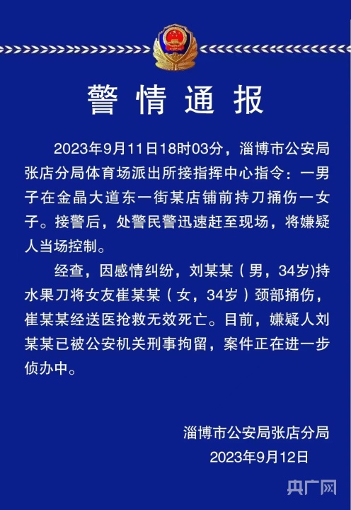 央廣網(wǎng)淄博9月12日消息(記者程立龍)9月12日,山東淄博警方發(fā)布通報稱,一男子當街行兇致女友死亡,男子已被公安機關(guān)刑事拘留。通報原文如下: