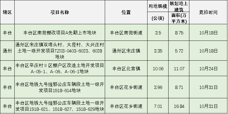 根據(jù)北京市規(guī)自委網(wǎng)站顯示,10月份北京還將有5宗宅地入市,其中豐臺(tái)4宗、通州1宗。