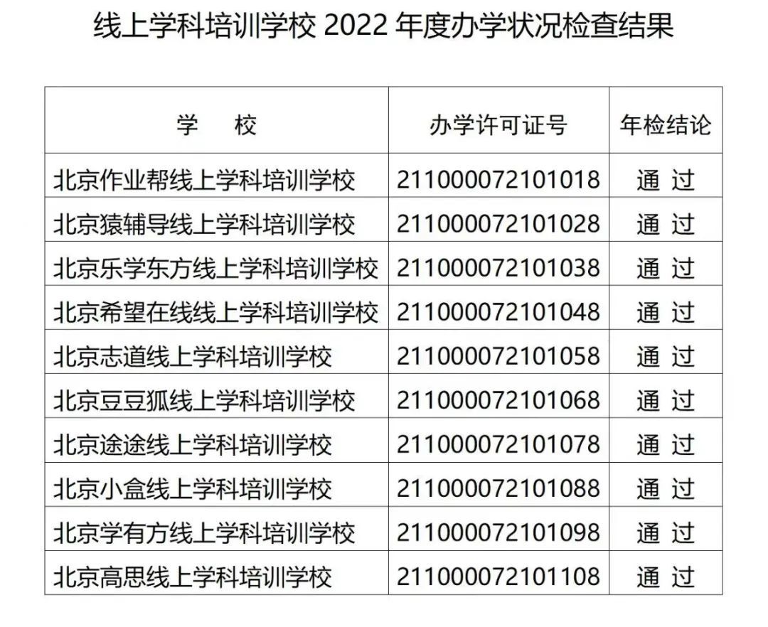 北京市教委公布2022年線上學(xué)科培訓(xùn)學(xué)校辦學(xué)評估結(jié)果 10家通過