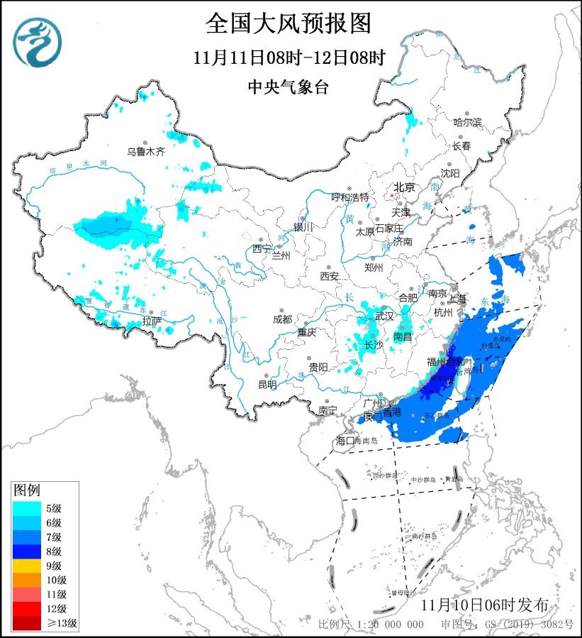預(yù)計,11月10日08時至11日08時,內(nèi)蒙古中東部、遼寧西部、安徽中南部、河南南部、江蘇南部、上海、湖北南部、湖南東北部、江西北部、浙江北部及東部沿海、福建沿海、臺灣島沿海等地有5~6級、陣風(fēng)7~8級的大風(fēng);黃海大部海域、東海大部海域、臺灣海峽、臺灣以東洋面偏北海域、南海東北部偏北海域?qū)⒂?~8級、陣風(fēng)9~10級的大風(fēng)。