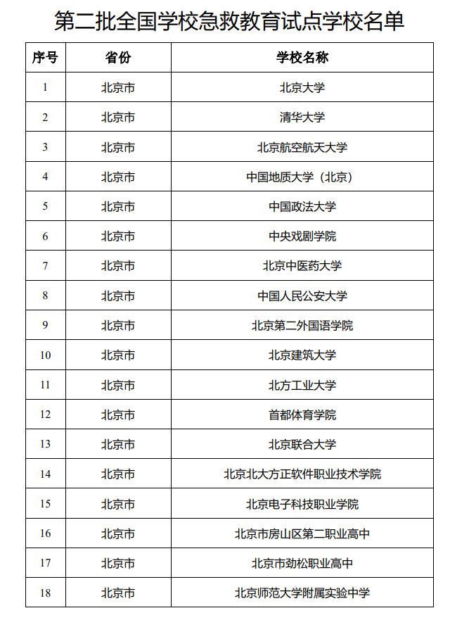 北京大學(xué)等1000所學(xué)校被確定為第二批全國(guó)學(xué)校急救教育試點(diǎn)學(xué)校