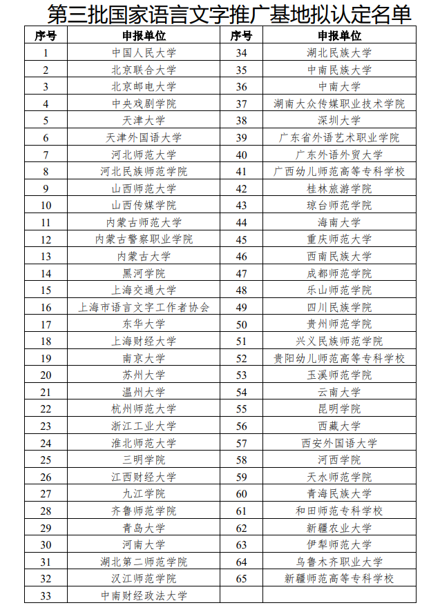 央廣網(wǎng)北京12月13日消息(記者 馮儀) 為深入貫徹落實(shí)黨的二十大、二十屆二中全會(huì)精神,落實(shí)《國(guó)務(wù)院辦公廳關(guān)于全面加強(qiáng)新時(shí)代語(yǔ)言文字工作的意見》,加大國(guó)家通用語(yǔ)言文字推廣力度,發(fā)揮國(guó)家語(yǔ)言文字推廣基地(以下簡(jiǎn)稱推廣基地)支撐作用,根據(jù)《國(guó)家語(yǔ)言文字工作委員會(huì)關(guān)于印發(fā)〈國(guó)家語(yǔ)言文字推廣基地管理辦法〉的通知》(國(guó)語(yǔ)〔2022〕3號(hào)),按照教育部評(píng)審競(jìng)賽管理要求,教育部、國(guó)家語(yǔ)委組織開展了第三批推廣基地申報(bào)評(píng)審工作。經(jīng)全國(guó)各省級(jí)教育(語(yǔ)言文字工作)部門遴選推薦、專家評(píng)審、實(shí)地考察、綜合評(píng)議等程序,擬認(rèn)定中國(guó)人民大學(xué)等65家單位為第三批推廣基地。