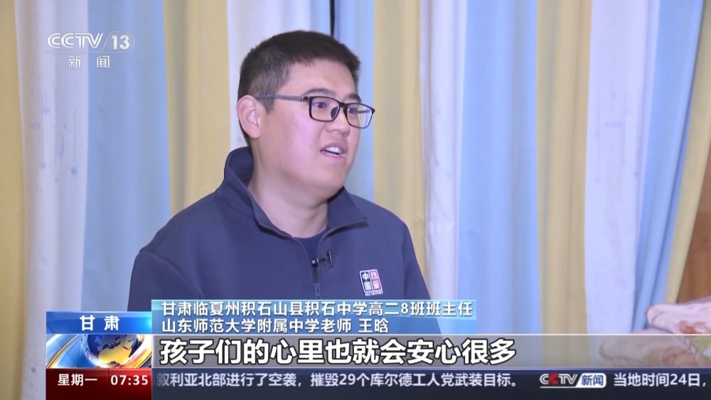 甘肅臨夏州積石山縣積石中學(xué)高二8班班主任、山東師范大學(xué)附屬中學(xué)老師 王晗:大約到4點多鐘,這時候?qū)W校就說家住縣城的或者說條件允許的,讓家長來接,要求我們,也是我們應(yīng)該做的,手把手地把學(xué)生交到家長的手里。