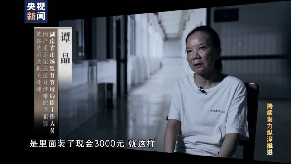 湖南省市場(chǎng)監(jiān)督管理局原工作人員 譚晶:他就拿了一個(gè)信封,在沒人的地方他就悄悄塞給我,他說(shuō)是我們單位的資料。然后我回去以后發(fā)現(xiàn)是里面裝了現(xiàn)金3000元,就這樣。所以我不逃避我自己的(責(zé)任),犯了法要承擔(dān)法律的責(zé)任,一定要。