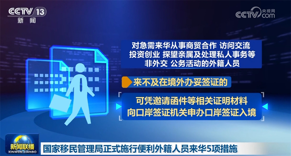 5項新舉措主要包括:放寬來華外籍人員申辦口岸簽證條件。對急需來華從事商貿合作、訪問交流、投資創(chuàng)業(yè)、探望親屬及處理私人事務等非外交、公務活動的外籍人員,來不及在境外辦妥簽證的,可憑邀請函件等相關證明材料向口岸簽證機關申辦口岸簽證入境。