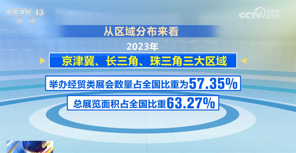 從區(qū)域分布來看,2023年京津冀、長三角、珠三角三大區(qū)域舉辦經貿類展會數量占全國比重為57.35%,總展覽面積占全國比重63.27%。