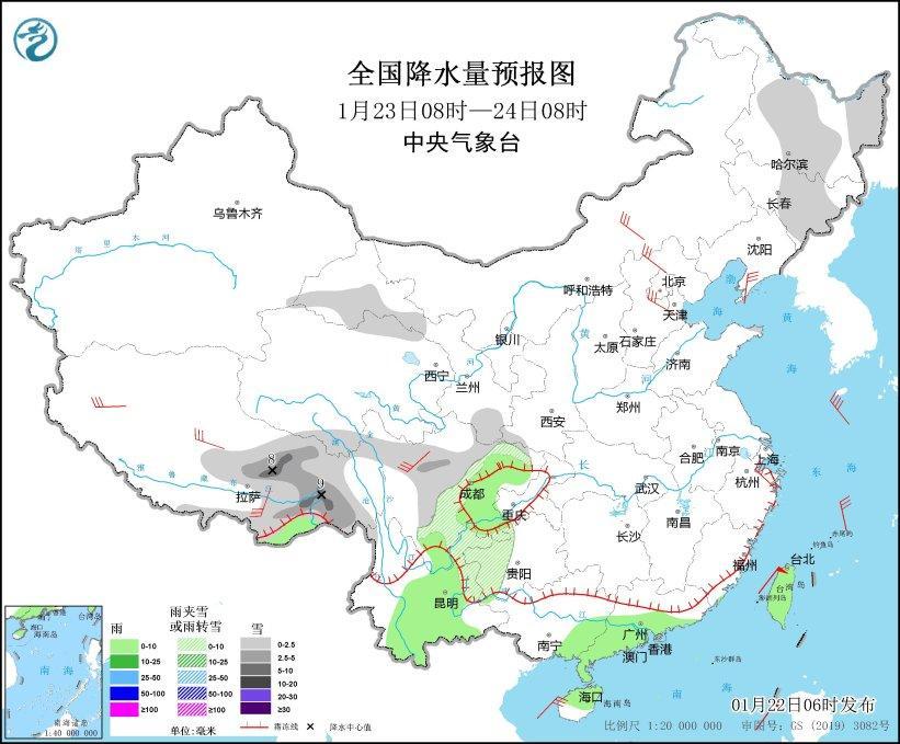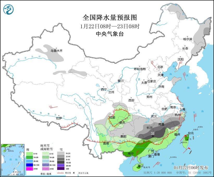 1月22日08時(shí)至23日08時(shí),黑龍江東部和西北部、吉林東部、新疆中部、甘肅河西、川西高原西南部、四川盆地南部、陜西南部、重慶東部、云南東部、貴州、湖北西部、湖南南部、江西、安徽南部、浙江中南部、福建北部、廣東北部、廣西北部等地部分地區(qū)有小到中雪或雨夾雪,其中,湖南南部、江西中南部、浙江西南部、福建西北部、廣西東北部、廣東北部等地部分地區(qū)有大到暴雪(10~15毫米)。四川盆地中部、云南中部、廣西中南部、廣東中南部、福建中南部、海南島、臺(tái)灣島等地部分地區(qū)有小到中雨。遼東半島、河北北部、浙江北部、廣西東南部沿海等地部分地區(qū)有5~6級(jí)風(fēng),渤海、渤海海峽、黃海、東海、臺(tái)灣海峽、臺(tái)灣以東洋面、巴士海峽、南海大部、北部灣等海域有6~8級(jí)風(fēng),陣風(fēng)9~10級(jí)(見(jiàn)圖3)。