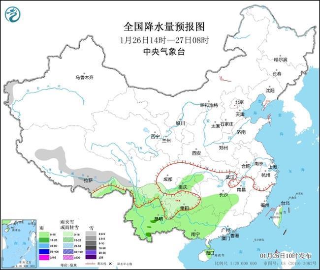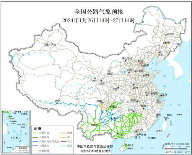 預(yù)計(jì)1月26日14時(shí)至27日14時(shí),西藏南部、四川南部、貴州中北部、云南東北部等地部分道路受小到中雪或雨夾雪影響;重慶、云南、貴州南部、廣西、湖南中南部、江西中部等地部分道路受小到中雨影響;貴州西部等地部分道路受凍雨影響。另外,吉林中部、四川中東部、云南中部、新疆西北部等地局部道路受霧影響能見度低。