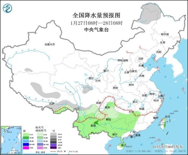 26日下午至夜間,新疆南疆西部山區(qū)、西藏西部和南部、四川南部、貴州西北部、云南北部等地部分地區(qū)有小到中雪或雨夾雪;云南中南部、貴州南部、湖南南部、華南北部和西部等地部分地區(qū)有小到中雨。