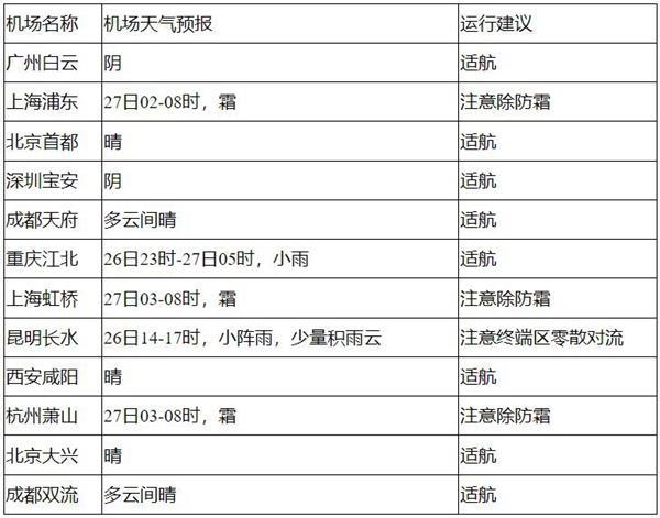 26日中午至27日中午,全國大部機(jī)場(chǎng)適航,27日凌晨至早間,哈爾濱、長(zhǎng)春、沈陽、青島、南京、合肥、虹橋、浦東、杭州等機(jī)場(chǎng)有霜;另外,26日午后,云南中南部航路有分散對(duì)流。
