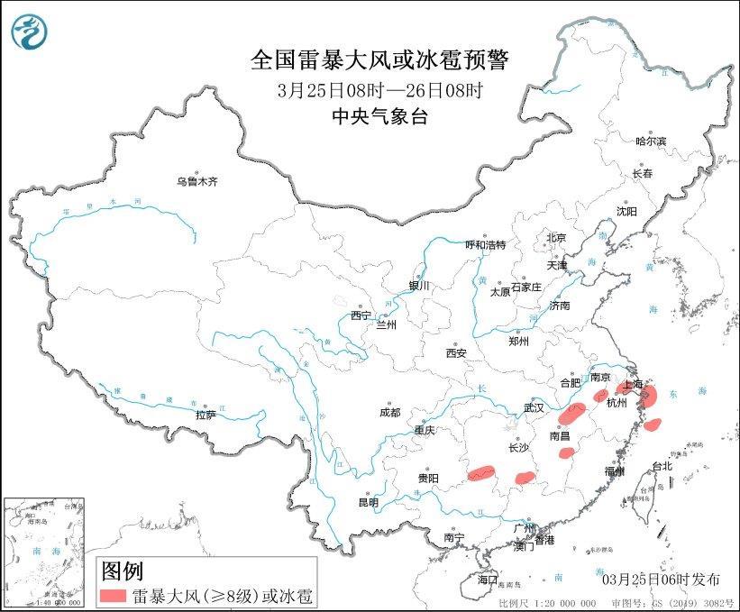 預計3月25日08時至26日08時,安徽南部、湖南南部、江西中北部、浙江北部、廣西東北部等地的部分地區(qū)將有8—10級雷暴大風或冰雹天氣;安徽南部、江蘇南部、上海西南部、湖南南部、江西、浙江中北部和東南部、福建西北部、廣西東北部等地的部分地區(qū)將有短時強降水天氣,最大小時雨量20-40毫米,局地可達50毫米以上。