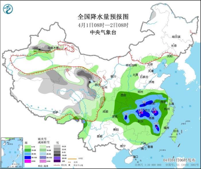 4月1日08時(shí)至2日08時(shí),新疆沿天山地區(qū)和南疆盆地、西藏北部和東部、青海大部、川西高原北部等地部分地區(qū)有小到中雪或雨夾雪,其中,新疆沿天山地區(qū)和南疆盆地、青海東北部等地部分地區(qū)有大到暴雪,新疆沿天山地區(qū)局地大暴雪(20~21毫米)。陜西東南部、河南中南部、安徽大部、江蘇中西部、四川東部、重慶大部、貴州東北部、湖北、湖南中北部、江西大部、浙江中西部、福建中西部等地部分地區(qū)有中到大雨,其中,河南南部、安徽中南部、湖北東部和南部、湖南北部和西部、江西北部和東南部、福建西部、重慶東南部等地部分地區(qū)有暴雨,局地大暴雨(100~120毫米)。內(nèi)蒙古西北部、新疆東部、青海西部、甘肅河西等地部分地區(qū)有4~6級(jí)風(fēng),其中,新疆東部部分地區(qū)有7~8級(jí)風(fēng),山口風(fēng)力可達(dá)11級(jí)以上。