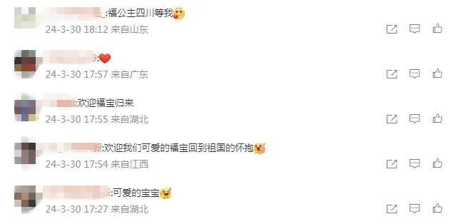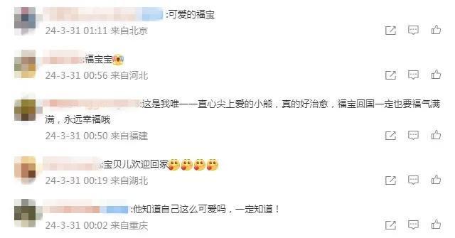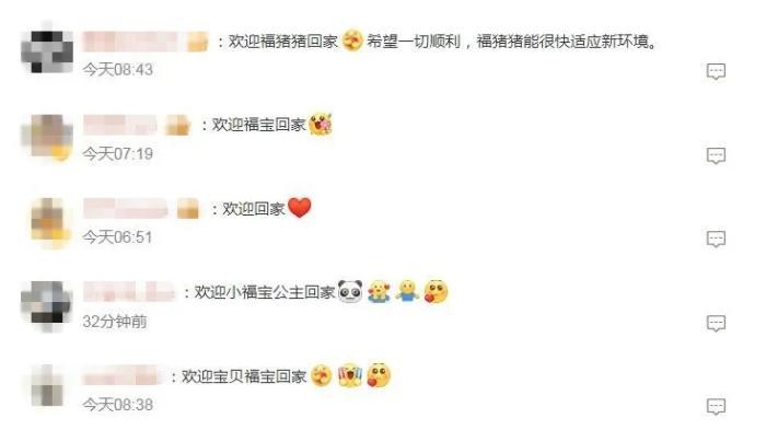 有網(wǎng)友寫道,祝愿“福寶”一切順利,“能很快適應(yīng)新環(huán)境”。還有網(wǎng)友表示,“福寶回國后一定也要福氣滿滿,永遠(yuǎn)幸福哦!”
