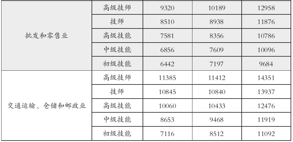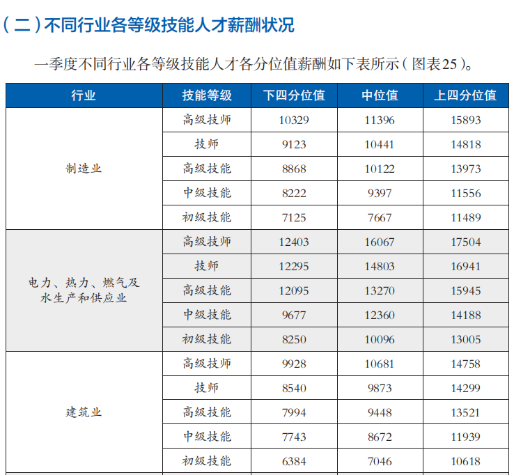 一季度部分行業(yè)各等級(jí)技能人才薪酬分位值(單位:元/月)(圖源:北京市人力資源和社會(huì)保障局官方網(wǎng)站截圖)