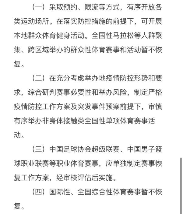 (四)國(guó)際性、全國(guó)綜合性體育賽事暫不恢復(fù)。