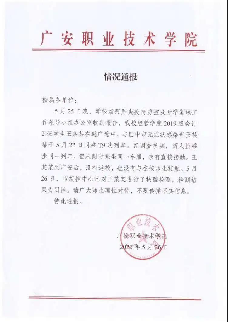 公告稱, 5月25日晚,廣安職業(yè)技術(shù)學(xué)院新冠肺炎疫情防控及開學(xué)復(fù)課工作領(lǐng)導(dǎo)小組辦公室收到報(bào)告,該校經(jīng)管學(xué)院2019級會(huì)計(jì)2班學(xué)生王某某在返廣(安)途中,與巴中市無癥狀感染者張某某于5月22日同乘T9次列車。經(jīng)調(diào)查核實(shí),兩人雖乘坐同一列車,但未同時(shí)乘坐同一車廂,未有直接接觸。王某某到廣安后,沒有返校,也沒有與在校師生接觸。5月26日,廣安市疾控中心對王某某進(jìn)行核酸檢測,檢測結(jié)果為陰性。
