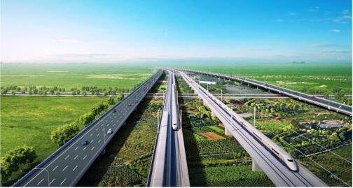 北京大興國(guó)際機(jī)場(chǎng)高速、京雄城際鐵路、軌道交通新機(jī)場(chǎng)線并走廊效果圖。(北京市發(fā)改委供圖)