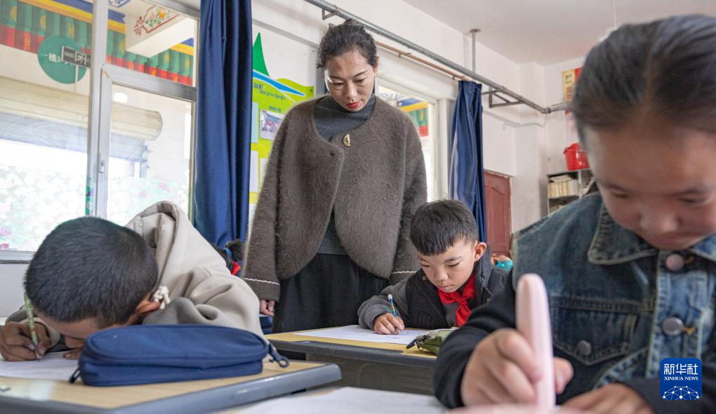 班戈縣中石化小學的老師德吉措姆在督促學生完成試卷(6月22日攝)。