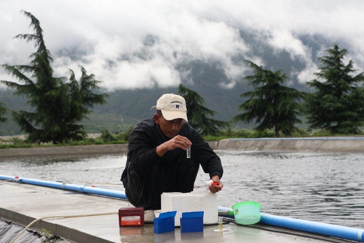 尼瑪旺堆在撒料、測水質(zhì)。
