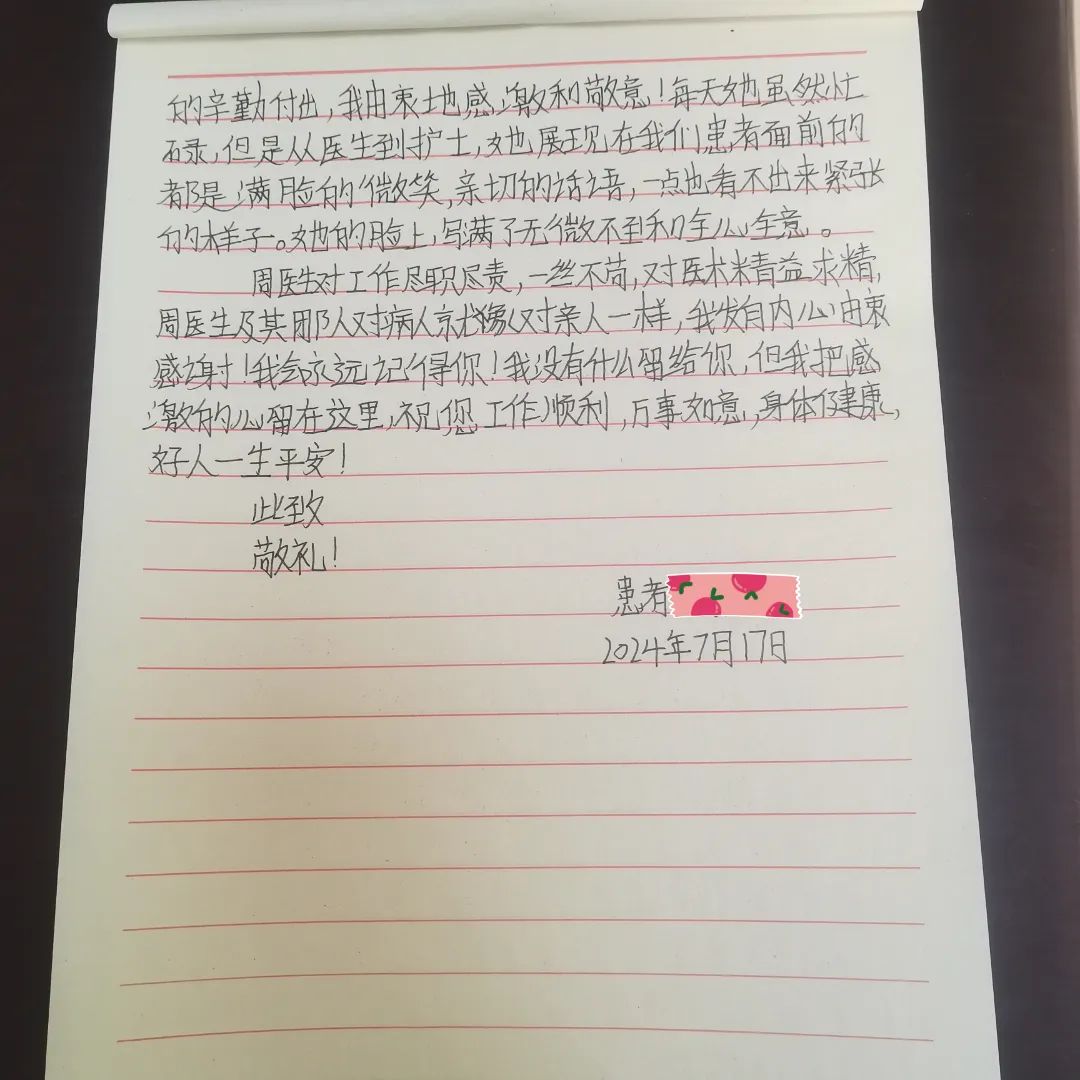 7月1日,一名在德格縣人民醫(yī)院就診的結(jié)核患者向成都市公共衛(wèi)生臨床醫(yī)療中心援藏醫(yī)師周瑜送來了一封感謝信,在信中,患者對周瑜醫(yī)生及其團(tuán)隊在住院期間給予她的積極診治和熱情關(guān)懷表示感謝,并對科室團(tuán)隊的診療技術(shù)和治療的預(yù)后效果都作出了非常高的評價。