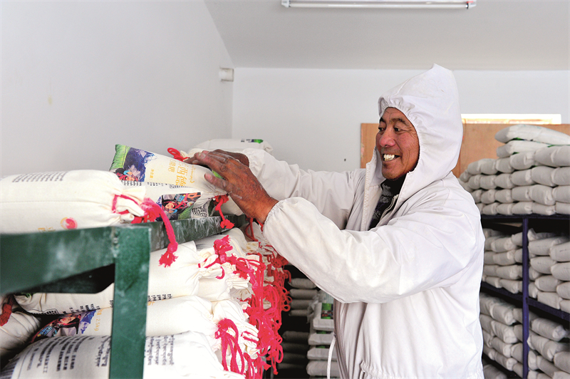 沿著西德村一片田野坡地向下步行10分鐘,便來到了孔雀河邊,只見一條人工修建的水渠,將孔雀河水引入到蓄水池,再帶動一旁水磨房里的石磨不停轉(zhuǎn)動,把炒熟的青稞慢慢磨成細(xì)粉狀的白色糌粑?!扒皫啄辏覀兗业氖杖雭碓粗饕糠N田和國家補(bǔ)助,小兒子要讀大學(xué),我只能外出打工,經(jīng)常一走就是好幾個月,也照顧不了家里?!苯衲?3歲的公司糌粑技術(shù)負(fù)責(zé)人巴桑次仁說。好在勤勞踏實的巴桑次仁積攢下了不錯的口碑,2020年他被村民選舉推薦成為了西德稞原地食品有限公司糌粑技術(shù)負(fù)責(zé)人。平日里,他除了磨制糌粑外,還負(fù)責(zé)為村民指導(dǎo)教學(xué),讓更多群眾學(xué)到一技之長。進(jìn)入公司三年多來,巴桑次仁每月工資有5千多元,加上銷售青稞收入、公司分紅以及政策性補(bǔ)助,全家去年總收入達(dá)到12萬多元?!艾F(xiàn)在,我足不出村就能穩(wěn)定就業(yè),不用與家人分離,連家里的農(nóng)活也能顧上了?!卑蜕4稳矢吲d地說。