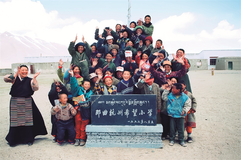 那曲杭州希望小學(xué)建成時,老師和學(xué)生在石碑前合影留念。那曲市色尼區(qū)委宣傳部供圖