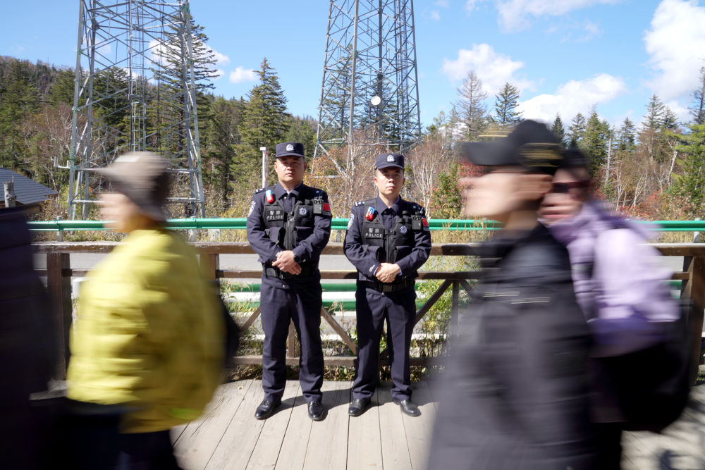 吉林長白山邊境管理支隊(duì)民警在景區(qū)游客密集處執(zhí)勤。