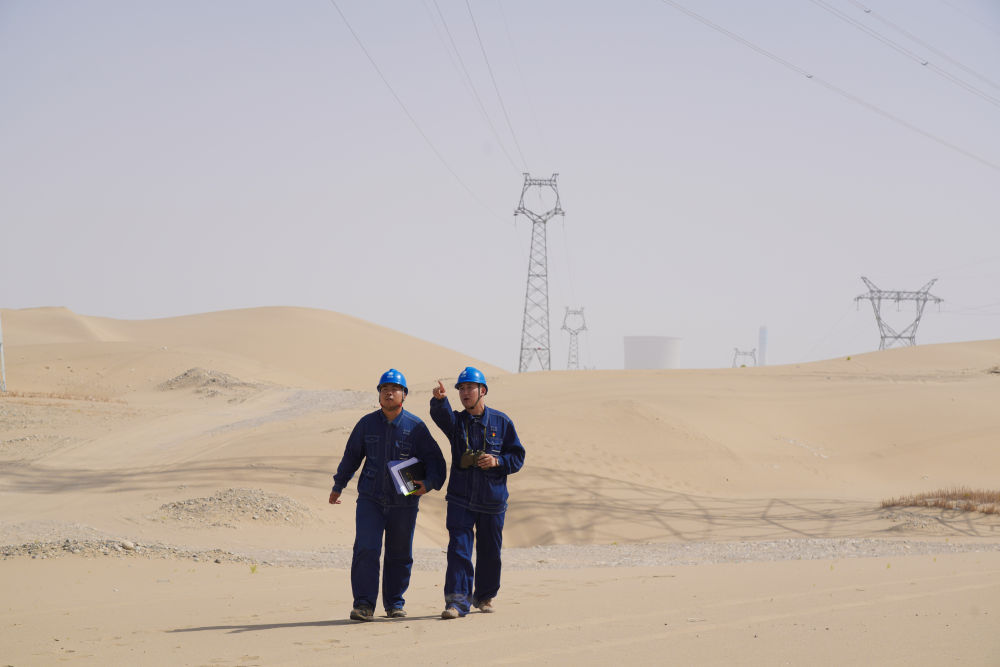 夏布哈提·馬合思提江(右一)和同事一起進(jìn)行線路巡視工作。