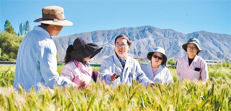 8月16日,山東援藏農(nóng)業(yè)專家、日喀則市農(nóng)牧業(yè)科學(xué)研究推廣中心副主任張斌(中)在青稞試驗田里指導(dǎo)種植。經(jīng)濟(jì)日報記者 袁勇 攝