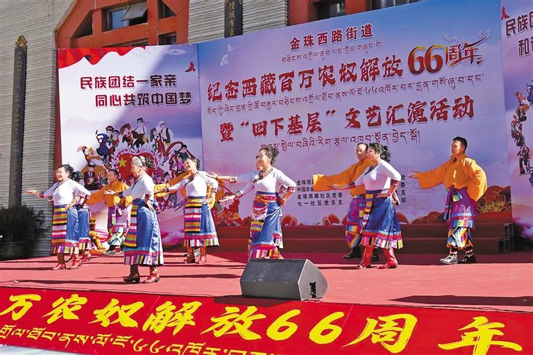 圖為拉薩市城關(guān)區(qū)金珠西路街道舉辦紀(jì)念西藏百萬農(nóng)奴解放66周年暨“四下基層”文藝匯演活動(dòng)現(xiàn)場。通訊員 扈顯嶺 攝