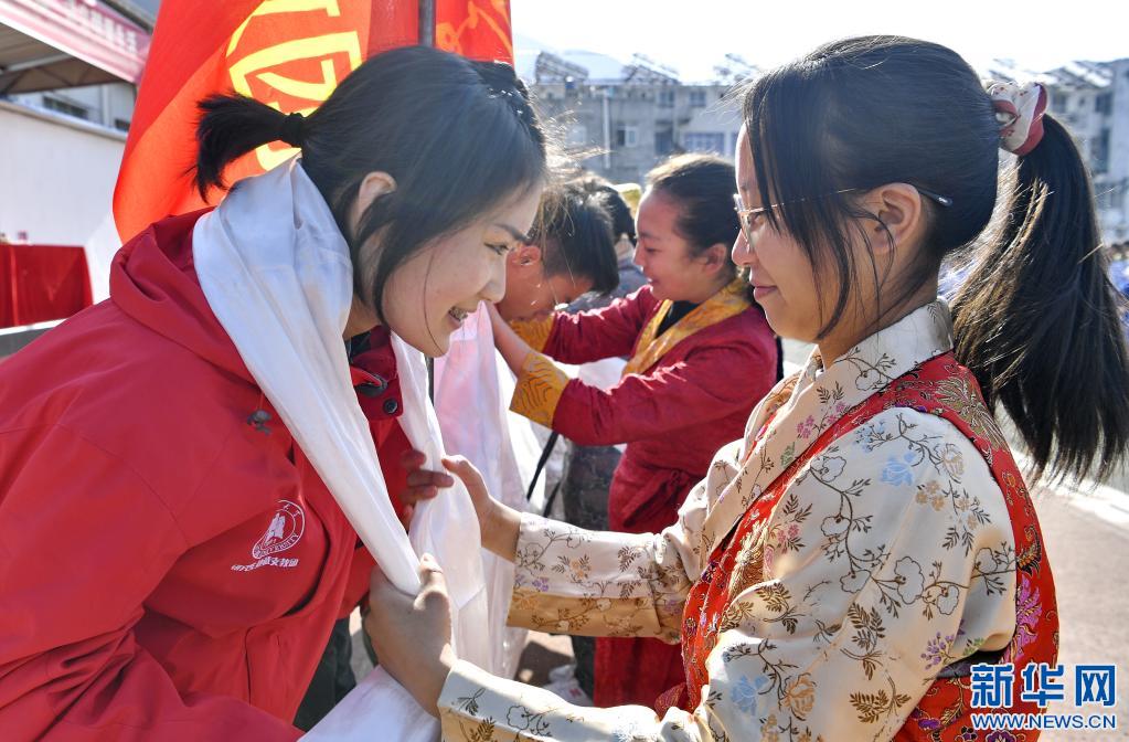 山南市東輝中學(xué)學(xué)生代表向湖北大學(xué)碩士研究生支教團成員獻哈達(3月29日攝)。新華社記者 張汝鋒 攝